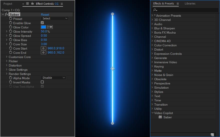 建立一個 Solid 純色圖層,將 Saber 效果拖曳到圖層後,透過 Effect Control 設定。