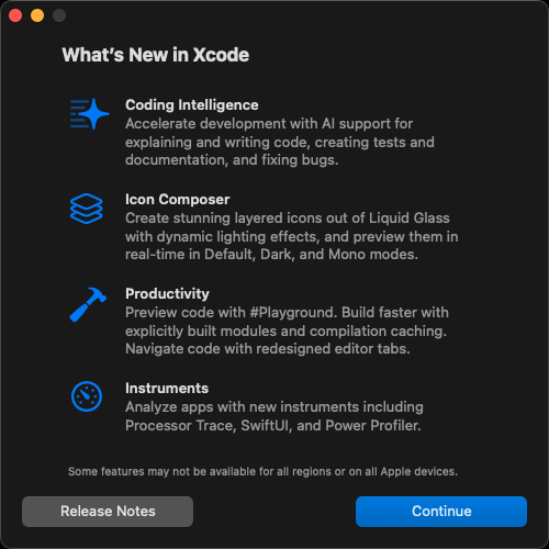 首先將 Xcode 下載到您的 Mac 系統,啟用 Xcode 時將出現新功能介紹,例如近期加入的 Coding Intelligence 工具。