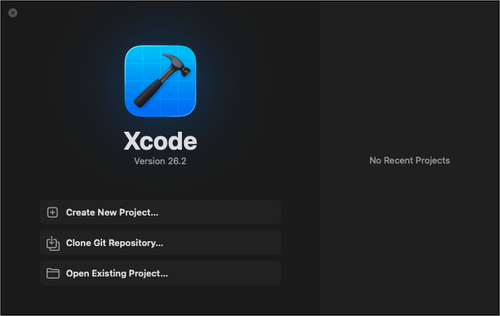您可以選擇建立新的 Xcode 專案、開啟現有的 Xcode 專案,或是從 Git Repository 複製專案。