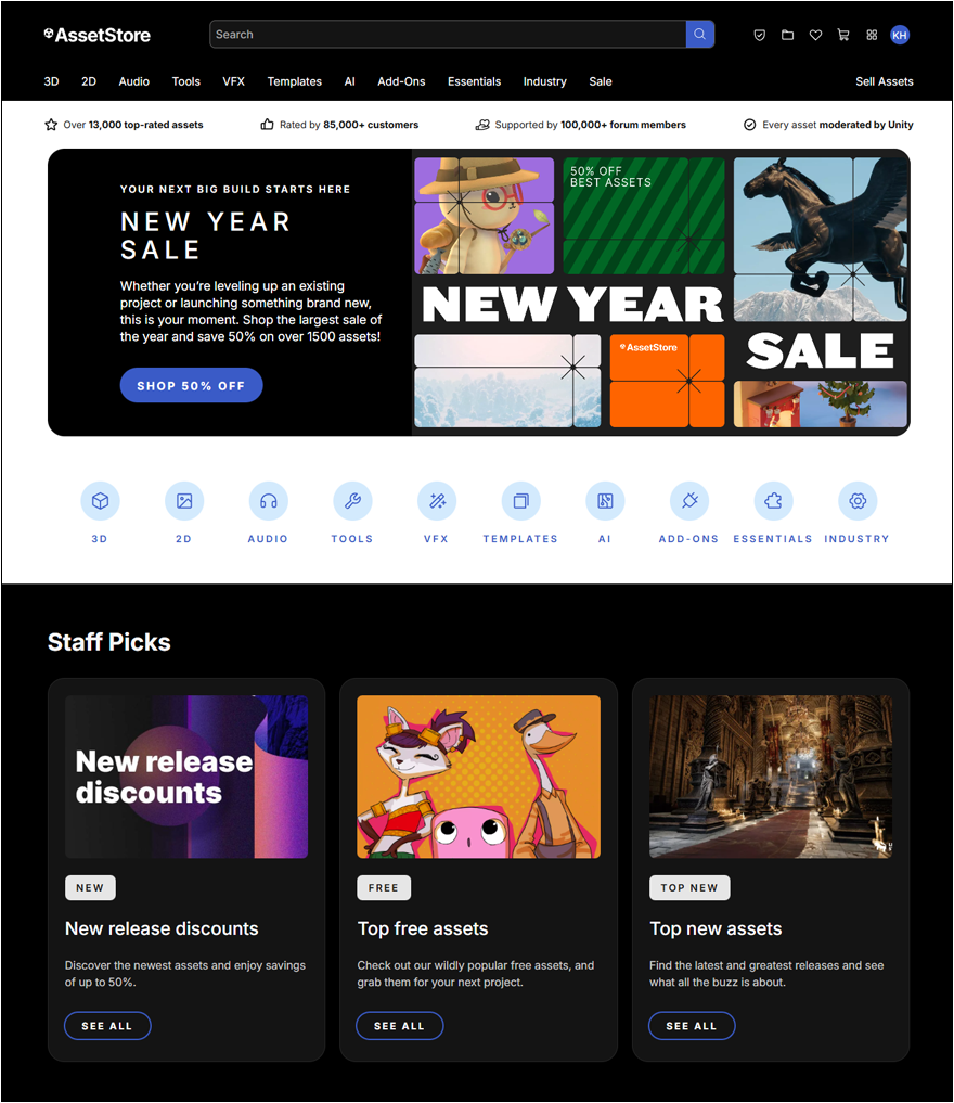 Asset Store 資源商店教學 優惠活動Asset Store 是 Unity 遊戲引擎官方的資源商店,提供 2D 美術、3D 模型、道具、材質、紋理、地形景觀製作工具、遊戲設計工具、音效與音樂、視覺化編程工具、行為腳本、編輯擴充程式等。此外提供大量 Unity 遊戲開發的學習資源,例如賽車遊戲、讓玩家可以自訂的角色、景觀創造…等完整專案或展示。資源商店的下載內容部分是免費的,其他的則需付費購買,您將會發現 Asset Store 擁有許多實用的資源,對於個人工作室或是中小型遊戲公司來說,利用資源商店的素材除了減少人力資源的投入,縮短開發時間,並可在競爭激烈的遊戲市場中取得優勢。 資源商店 [ https://assetstore.unity.com/ ]