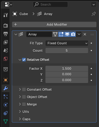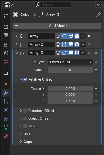 Array 陣列修改器,生成多個相同的物件,可指定距離與數量。 重複使用 Array 修改器可以在不同的方向生成物件。