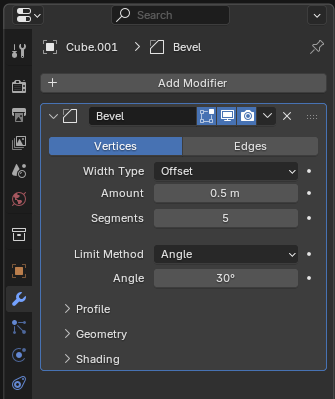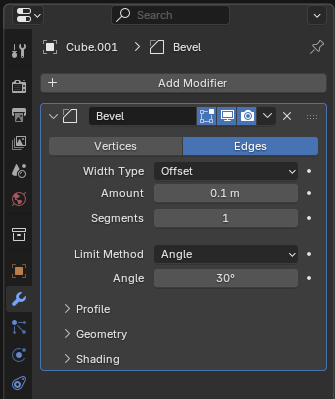 Bevel 修改器 - 使用物體的邊緣或頂點產生倒角效果。 下圖是 Edges 邊緣模式。 增加 Segments 分段得到倒圓角的效果。