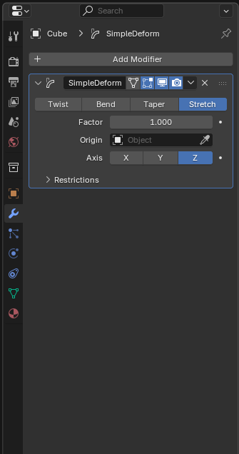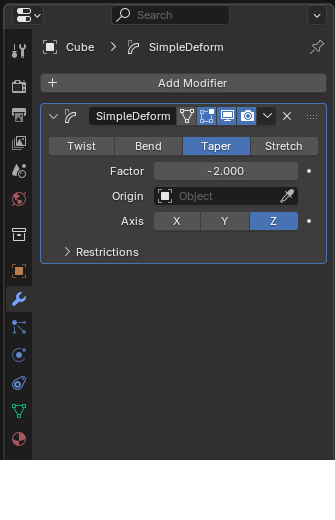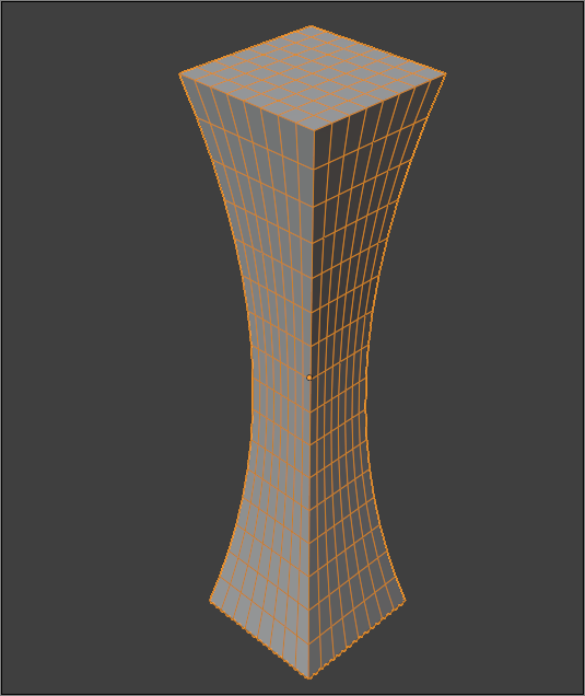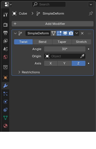 簡單變形 SimpleDeform 製作一個測試用的柱狀模型,使用細分增加表面的網格,如果表面網格的數量較少,變形後的外觀將會不平滑。 增加 SimpleDeform 修改器,預設的 Twist 將產生扭轉效果。 選擇 Bend 將產生彎曲效果,並可設定彎曲的角度與軸向。 選擇 Taper 將產生變尖的效果。 選擇 Stretch 將產生拉伸的效果。 修改器產生的效果不會對物體產生永久的改變,按 X 移除即可回復原狀,保留編輯的彈性。 接著看看 Blender 其他的修改器吧!
