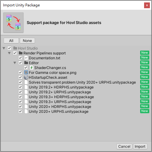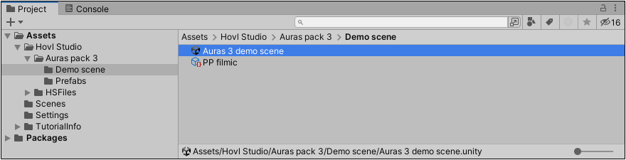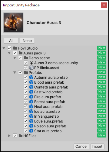 Character Auras 3 教學Character Auras 3 是一套支援 Unity 遊戲引擎的角色特效資源,本教學將介紹將 Character Auras 3 用於 VR 遊戲。 首先將 Character Auras 3 下載並匯入專案。若是 URP 專案需再匯入 Support package for Hovl Studio assets 資源。