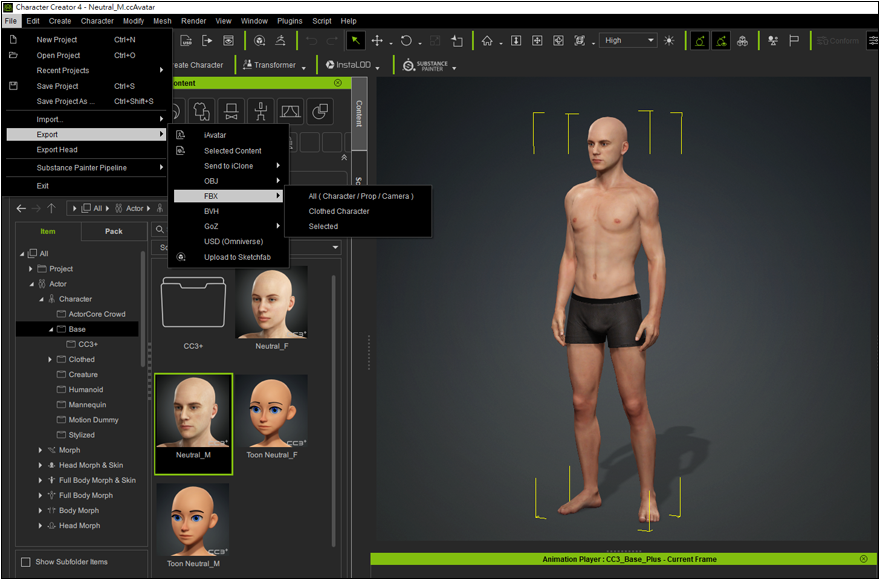 執行 [ File > Export > FBX > Clothed Character ] 匯出角色。