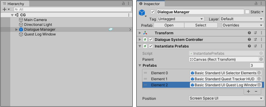 將複製產生的預製物件重新命名為 My UI Quest Log Window 。 ★ 拖曳到 Dialogue System Controller > Instantiate Prefabs 的 Prefabs > Element 2 欄位。