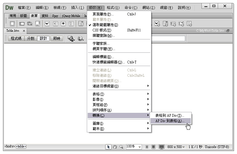 AP 元素轉換為表格 執行 [ 修改 > 轉換 > AP Div 到表格 ] 可將網頁上的 AP 元素轉換為表格。