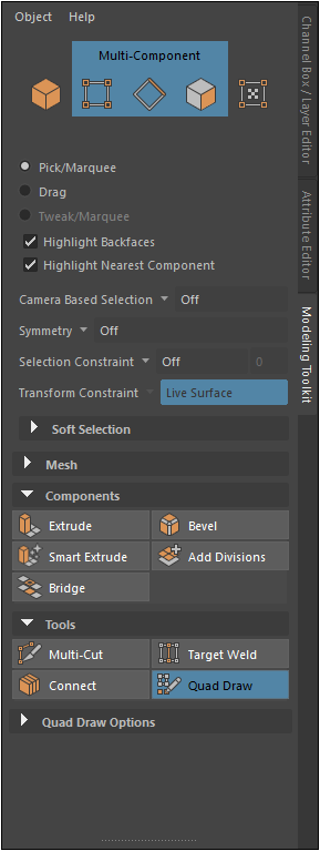 第一章 前置作業匯入高模與 Live Surface 設定 - 重新拓樸開始動手畫線之前,先將高面數模型導入 Maya 並轉為具有吸附功能的參考表面,這個動作是重新拓樸的基礎,如果沒有先打好基礎,後面將會需要更多時間修改。 步驟一:模型減面 - 重要!模型如果是 3D 掃描或來自 ZBrush 數位雕刻,建議先進行模型減面,Maya 的 Viewport 對於處理千萬級別的面數可能會比較吃力。為了操作上的順暢,建議先在 ZBrush 進行減面。 目標: 保持模型輪廓清晰即可,無需毛孔級別的細節,細節稍後可透過貼圖烘焙。 建議面數: 將模型減面至 50 ~ 100 萬面左右,進行編輯時可確保獲得流暢的操作。 步驟二:導入模型 - 打開 Maya 後,使用 File > Import... 導入模型或直接將檔案拖入視窗。 匯入後檢查模型是否位於世界座標中心,且大小比例是否符合真實尺寸,否則可能影響筆刷的敏感度。 步驟三:優化視覺對比 - 在灰色的高模上繪製灰色的新拓樸線,比較看不清楚,建議調整高模的材質: 選取 你的高模,右鍵按住 模型不放,選擇 Assign New Material > Lambert。 打開屬性編輯器 (Ctrl+A),點擊材質球標籤 (如 Lambert2),將材質的顏色調成 深灰色 或 黑色。 Quad Draw 的預設線條是亮藍色,深色背景可讓拓樸線條看得越清楚,長時間工作眼睛不吃力。