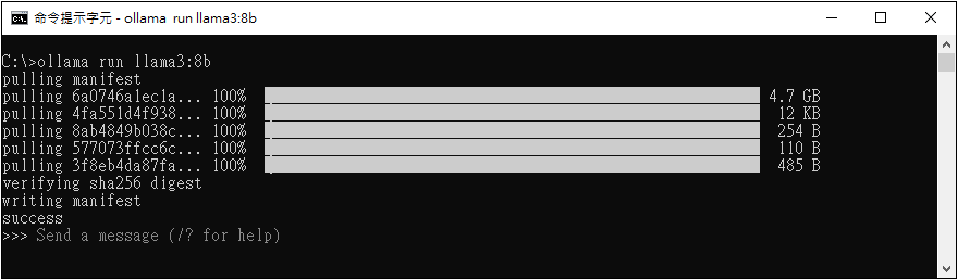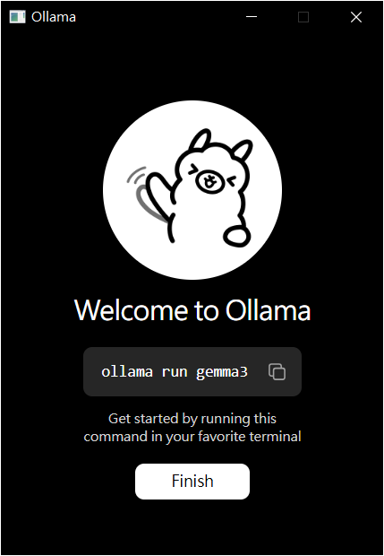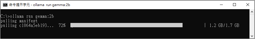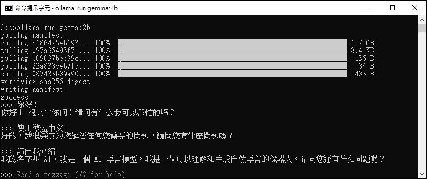 Ollama 安裝完成後,將執行預設的 LLM 模型,例如此版本是 gemma3 ,這個模型體積小且速度快!