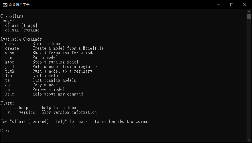 開啟 Windows 命令提示字元 或 macOS 終端機,輸入 ollama 將顯示可用的指令。