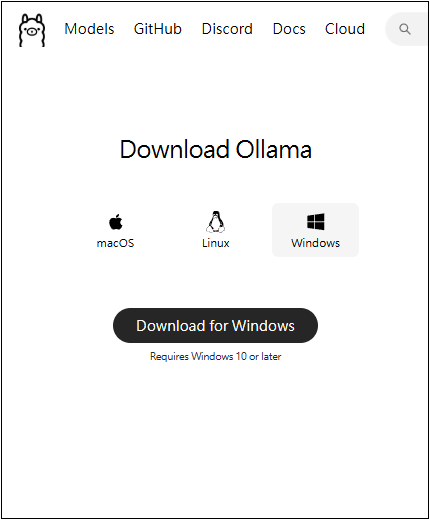 安裝 OllamaSetup.exe / Ollama-darwin.zip 175MB ( 需要 macOS 11 以上版本 )