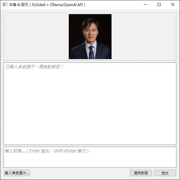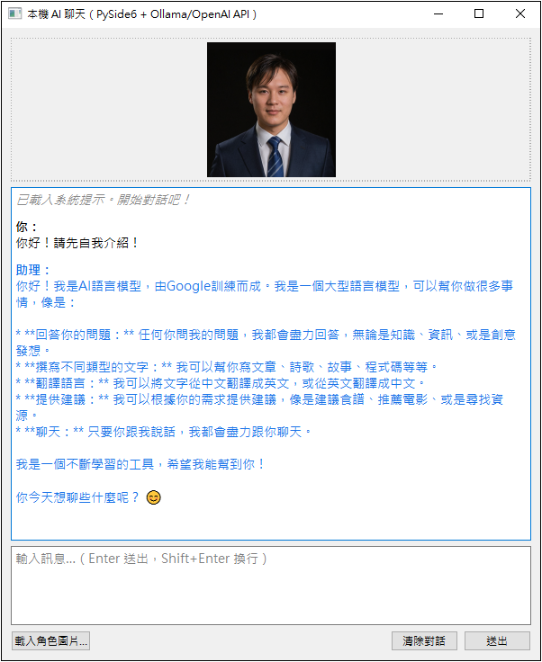 自行開發用戶端程式若您有開發程式的基礎,可以自行製作串接 Ollama 的應用程式,以下提供 Python 程式碼: [ ollama_chat_gemma3.py ] 使用 Gemma3 模型的 CLI 版本,最基本的文字對話,可用於測試 [ ollama_chat_gemma3_gui.py ] 改為使用 GUI 的版本