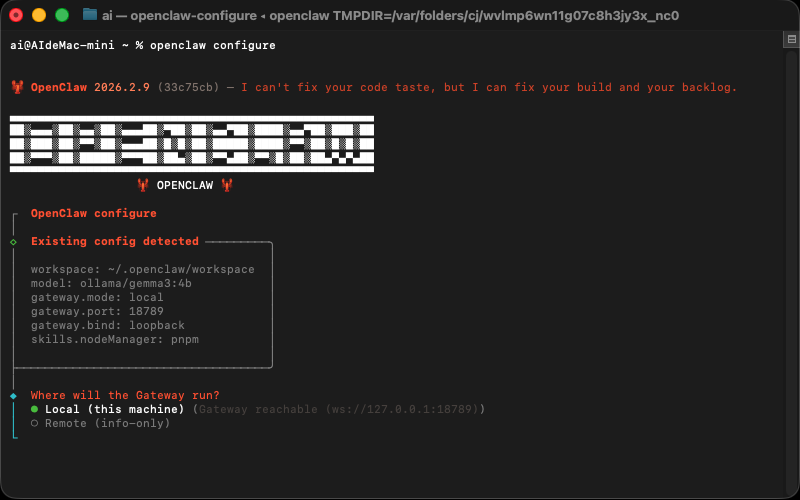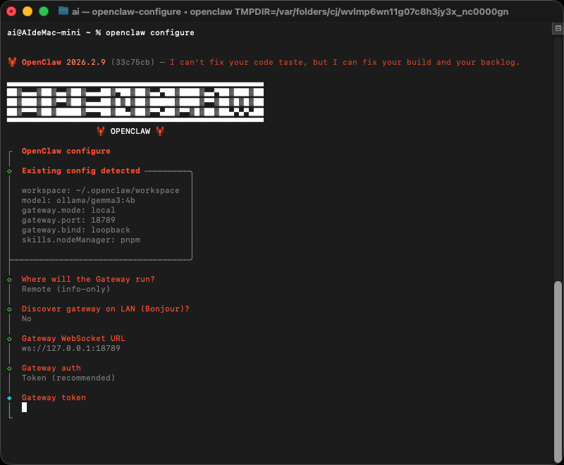 例如前面教學使用的 AI 模型是 Model: openai/gpt-5.1-codex ,後來改用 Ollama 本地端模型進行測試。 但覺得本地端模型較慢,改回原來的 OpenAI 模型,在終端機執行 openclaw configure 進入設定精靈。