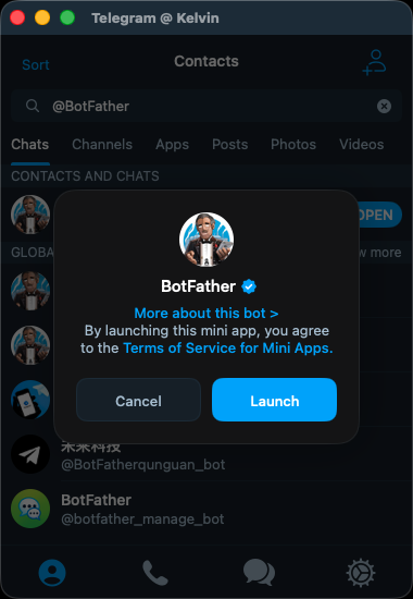 打開 Telegram 搜尋 @BotFather ( 官方機器人管理帳號 ) ,按下 Launch 按鈕。
