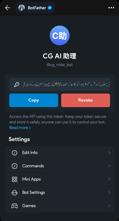 此時 BotFather 會提供一串 Bot Token(長得像 123456789:AA...)。