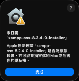 開啟網站下載的 xampp installer 時,將會因為 Apple 無法驗證是否為惡意軟體,將會先阻擋安裝。