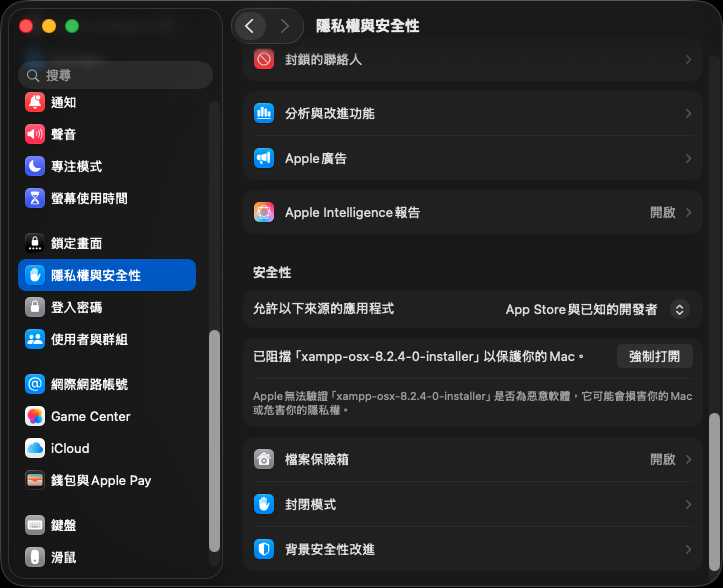 進入設定的「隱私權與安全性」後,將會看到已阻擋 xampp-osx-xxx-installer 以保護你的 Mac ,點擊「強制打開」。