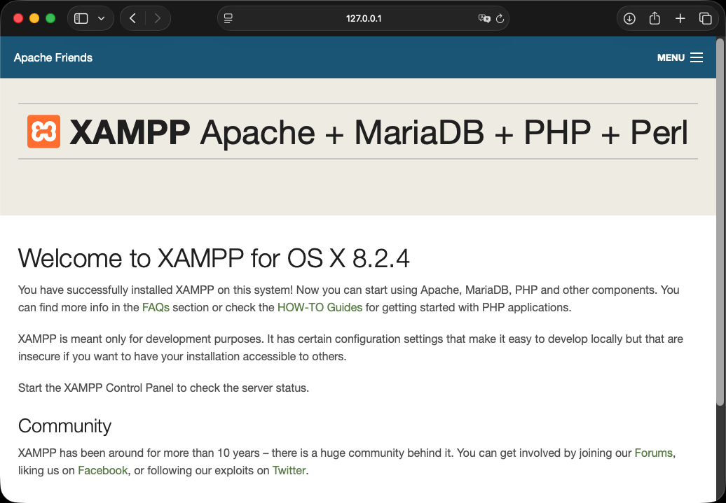 開啟網頁瀏覽器,網址輸入 127.0.0.1 或 localhost 若出現以下網頁,表示 XAMPP 已經正常運行。