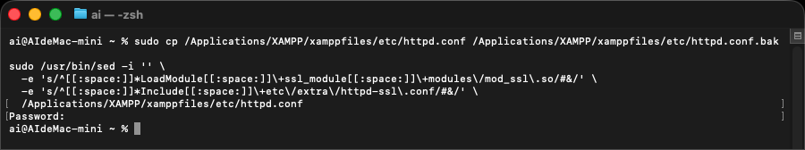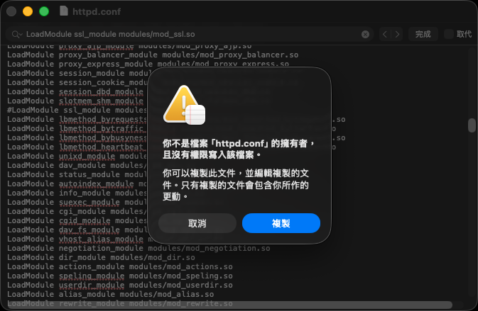 用指令直接註解(需要輸入密碼): sudo cp /Applications/XAMPP/xamppfiles/etc/httpd.conf /Applications/XAMPP/xamppfiles/etc/httpd.conf.bak sudo /usr/bin/sed -i '' \