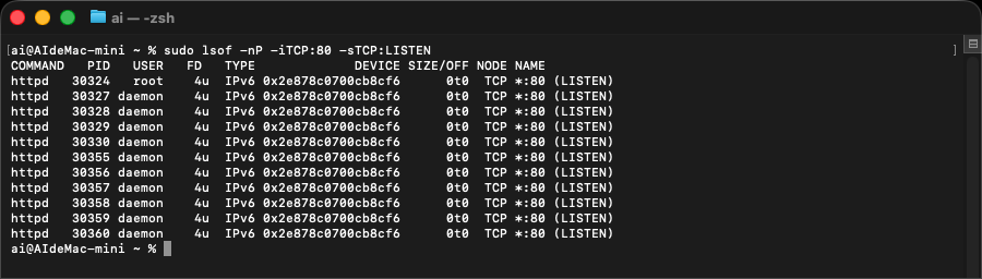 最後再確認 80 是否已經在 LISTEN sudo lsof -nP -iTCP:80 -sTCP:LISTEN