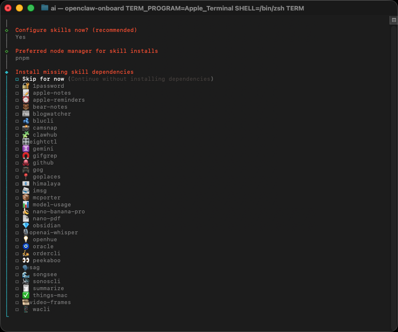 是否現在進行 OpenClaw 的技能(skills) 環境設定? npm : 最通用、最保守 ( Node.js 內建 ) pnpm : 更省空間、速度常更快,現在很常用 ( 推薦 ) ★ bun : 很快,但相容性偶爾會遇到問題 ( 新手先不建議 )