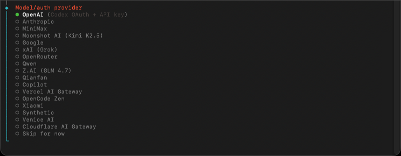 OpenClaw 需要搭配模型 ( OpenAI, Anthropic, Google ... ) 才能運行,也可以選擇 Skip for now 先跳過。本教學使用 OpenAI 。