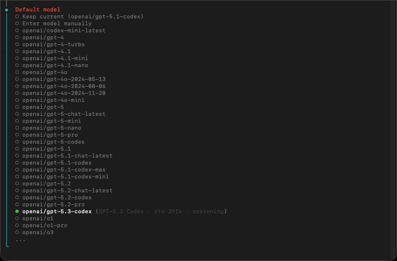 選擇 Default model 預設模型 ,代表 OpenClaw 已經讀取到 OpenAI API key,可以選一個預設要用的模型 。 建議可選 Keep current ,目前 openai / gpt-5.1-codex 模型穩定、相容性好,先讓 OpenClaw 架設流程跑完!