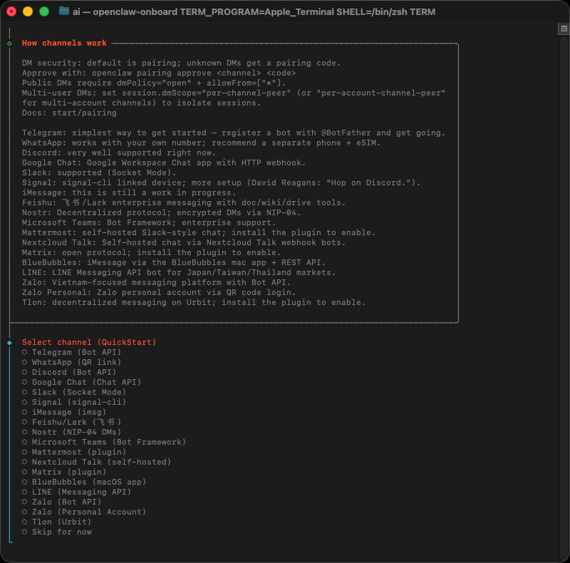 選擇通訊軟體,設定稍後從哪裡收訊息來互動 ,這裡可先選 Skip for now 跳過! 建議可申請一個提供 OpenClaw 的專用帳號,先不使用您的主要帳號做測試 … 使用網頁橋接方式,有時候需要重新登入、被踢下線、可能有停權的風險。