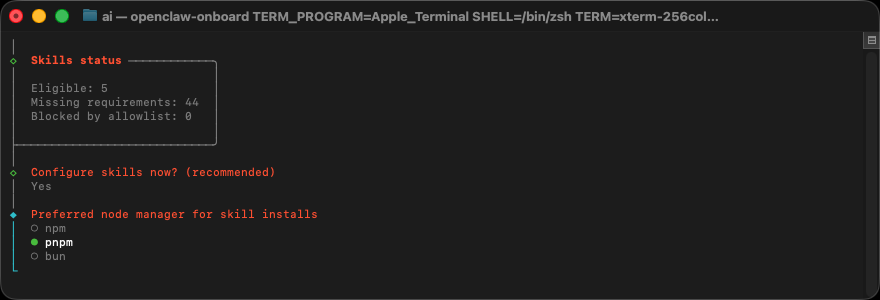 是否現在進行 OpenClaw 的技能(skills) 環境設定? npm : 最通用、最保守 ( Node.js 內建 ) pnpm : 更省空間、速度常更快,現在很常用 ( 推薦 ) ★ bun : 很快,但相容性偶爾會遇到問題 ( 新手先不建議 )