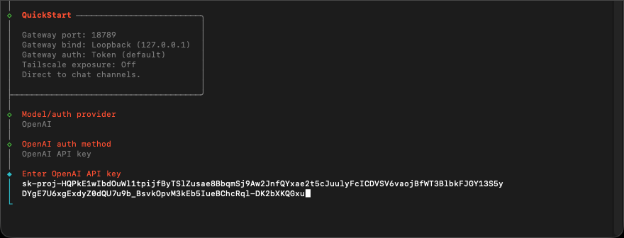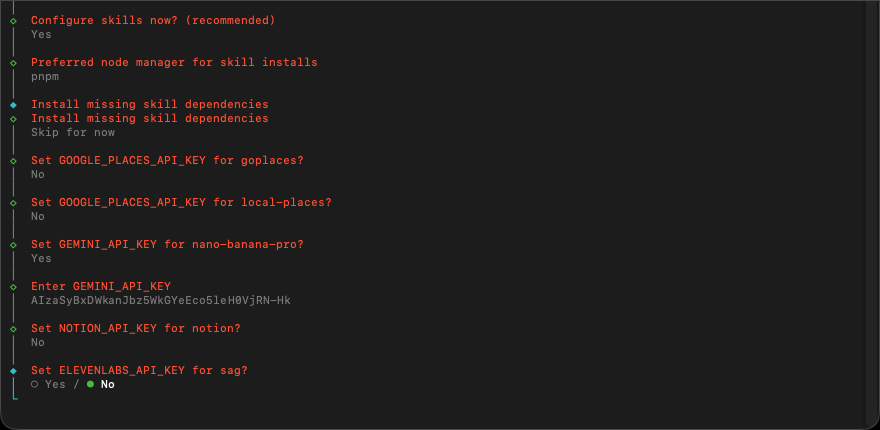 接著是設定各種 Skills 需要的第三方 API key 的選項畫面。雖然剛才選了 Skip 不安裝 … 但系統仍會將「如果要用某些雲端服務型 skills 需要先輸入 API key 列出來,讓你填寫… 設定 GOOGLE_PLACES_API_KEY for goplaces ? 設定 GOOGLE_PLACES_API_KEY for local-places ? 設定 GEMINI_API_KEY for nano-banana-pro ? 設定 GEMINI_API_KEY ? 設定 NOTION_API_KEY for notion ? 設定 ELEVENLABS_API_KEY ?
