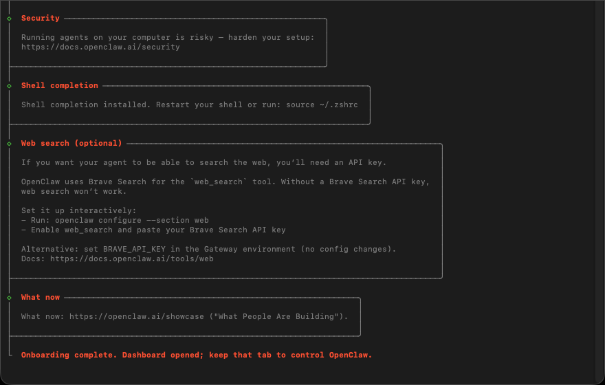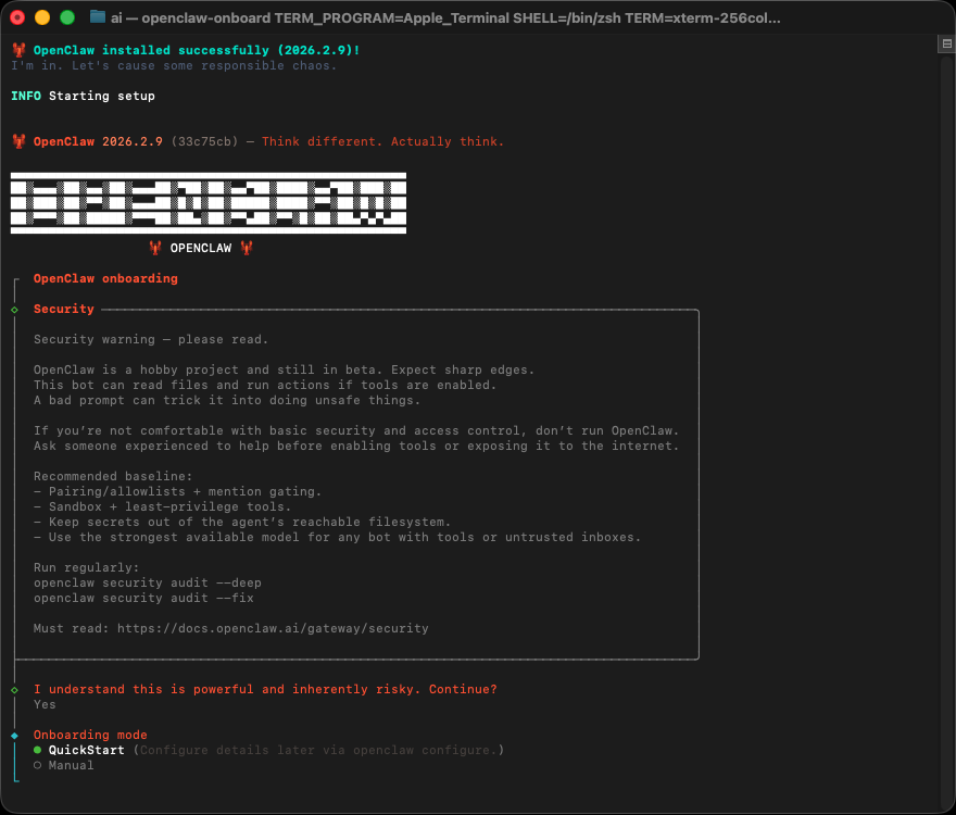 OpenClaw 安裝成功後,將出現 Onboarding 初始設定畫面,這是 「 安全告知 」 與 「 選擇導引模式 」 訊息。 若是啟用讀檔、跑指令、執行操作,就具備能做很多事的能力,因此有風險,理解風險後是否繼續? 這些資訊安全上的建議 ( 包括白名單、權限設定、不對外網公開 ) 都很重要! 端機互動介面通常是 ↑↓ : 移動選項 / Space : 勾選 / Enter : 確認