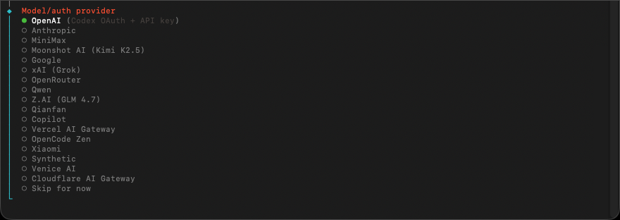 OpenClaw 需要搭配模型 ( OpenAI, Anthropic, Google ... ) 才能運行,不過可以選擇 Skip for now 跳過,稍後再進行設定。