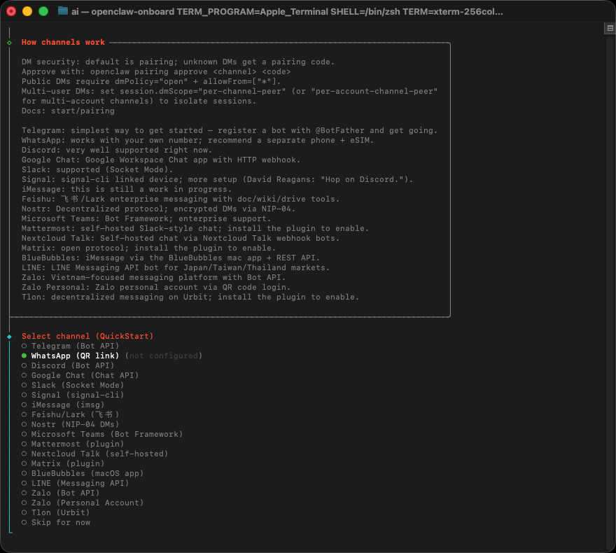 選擇通訊軟體,設定稍後從哪裡收訊息來觸發 Agent ,以下教學使用 WhatsApp (QR link) 不過,建議用 「 專用 WhatsApp 帳號 」 或至少別使用主要的私人帳號做測試。 因為這類 Web / 橋接方式有時候會需要重新登入、被踢下線、或有風險控管。