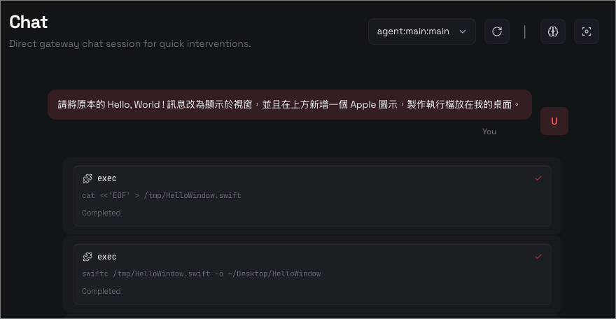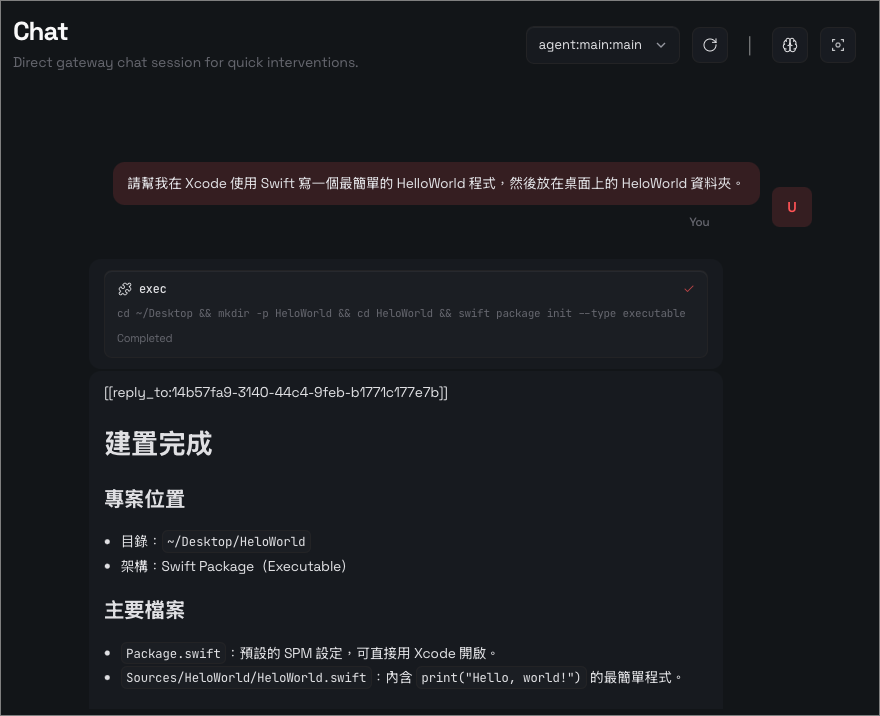 嘗試使用 OpenClaw 撰寫程式: 請幫我在 Xcode 使用 Swift 寫一個最簡單的 HelloWorld 程式,然後放在桌面上的 HeloWorld 資料夾。