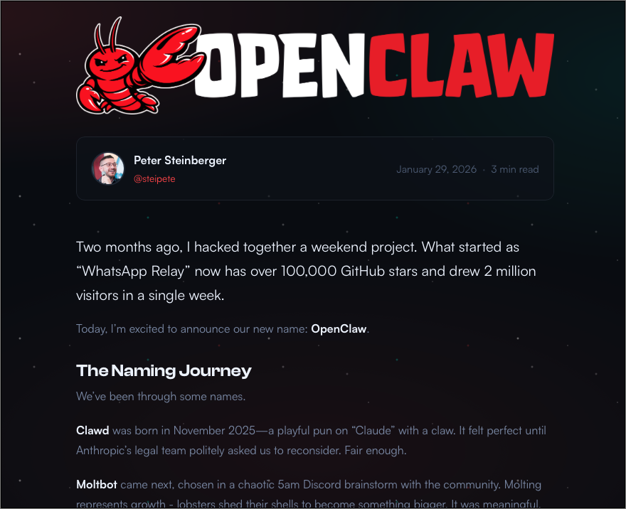OpenClaw 名稱演進此專案的命名演進,官網提到一開始是 WhatsApp Relay 週末專案雛形。 Clawd : 在 2025 年 11 月出現,但 Anthropic 來函要求改名,開發者基於商標與法律的考量選擇改名。 Moltbot : 在社群討論中產生;molt(脫殼)象徵龍蝦成長。 OpenClaw : 官方做了商標檢索,最後使用 OpenClaw 當做品牌名稱。