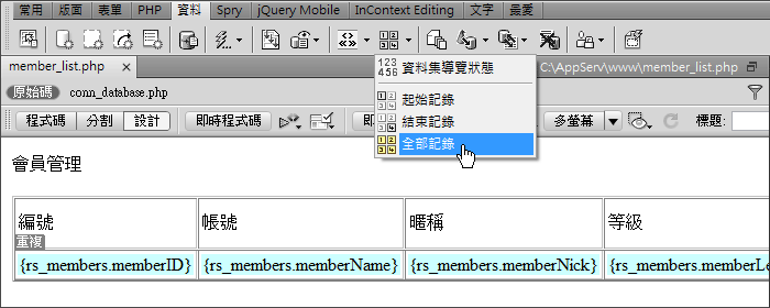 新增網頁,並檔案的名稱命名為 member_list.php。此網頁需要列出全部的會員,請先建立 rs_members 資料集。