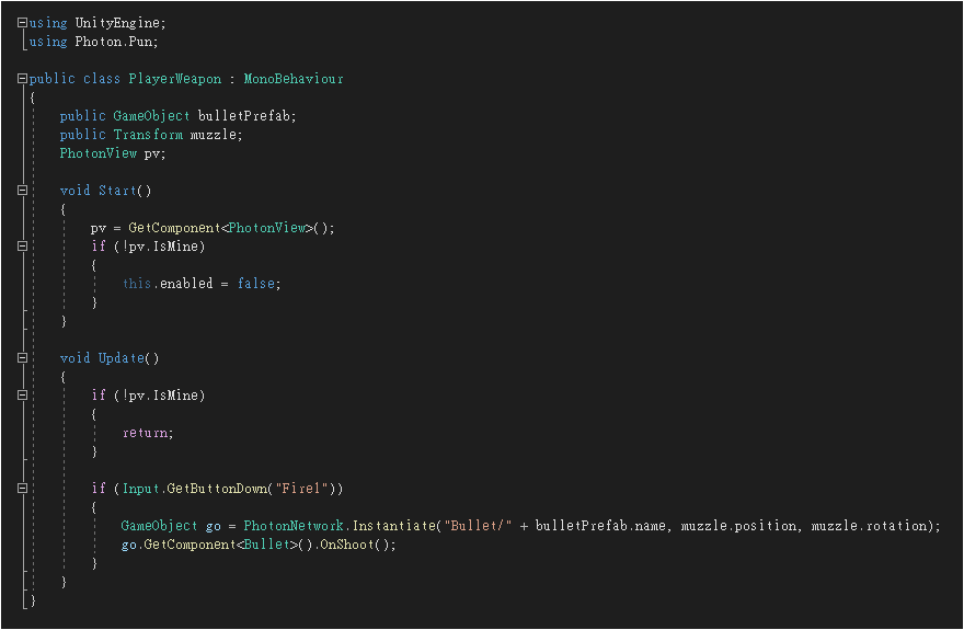 [參考另一種方法] 修改 PlayerWeapon.cs 腳本,透過 PhotonView.IsMine 判斷若是本地端玩家,按下 Fire1 時武器射擊。
