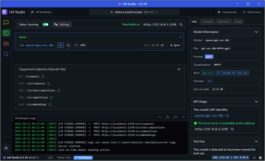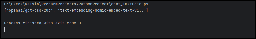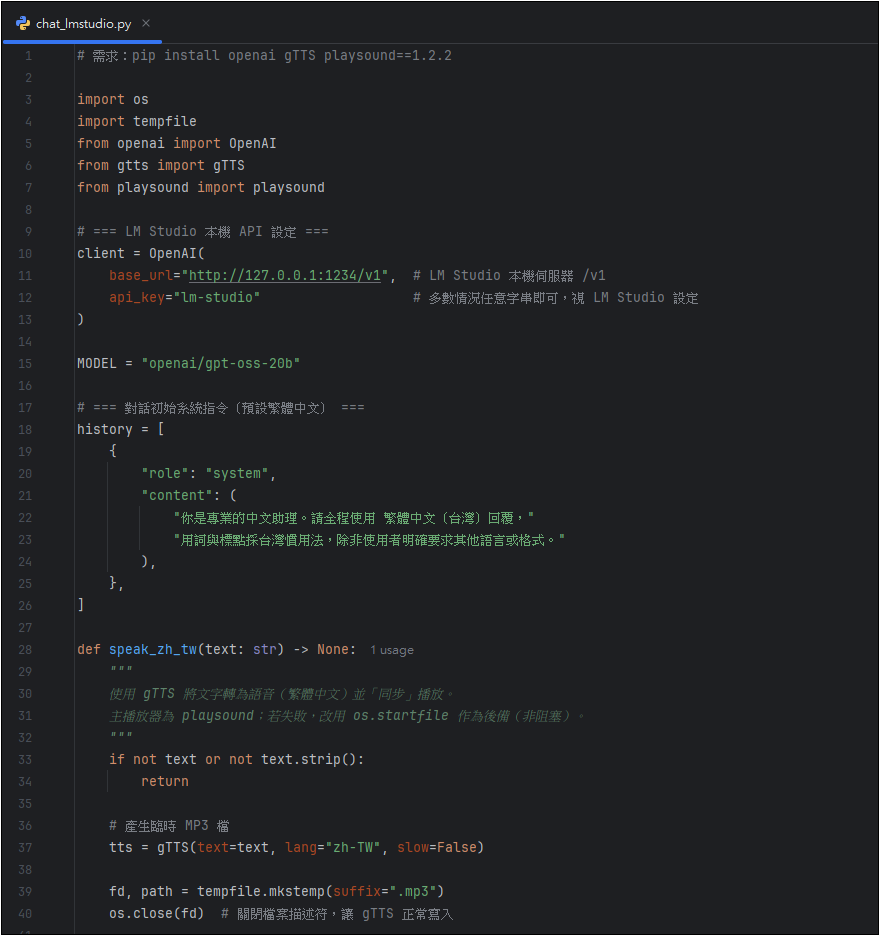 Python LM Studio 教學Author: Kelvin Huang相關連結 [ LM Studio 教學 ] [ 程式碼分享區 ] LM Studio 在啟用本地端伺服器後,等於把它變成一個可以「對外提供 API 的模型服務」。原本 LM Studio 只是在電腦上打開,手動輸入文字、得到回覆的桌面程式,當開啟伺服器功能,它就能模擬成像 OpenAI 或 Ollama 那樣的 API 介面,讓其他程式透過 HTTP 請求去呼叫你載入的本地模型。 這麼做的意義在於,模型不再只侷限於你在 LM Studio 介面裡用,而是能被整合進各種應用。您可以在 Python、Node.js、PHP 或 Unity 裡寫程式,透過 POST / GET 的方式把提示詞丟給 LM Studio,本地模型處理後再把輸出回傳,這樣就能像使用 OpenAI API 的效果,只是運算全在自己的電腦,不需要連線到外部伺服器。這對隱私、速度、或是想在封閉環境裡測試都特別有用。 本教學介紹使用 Python 整合 LM Studio 本地端伺服器製作 AI 助理。首先開啟 LM Studio 進入開發者頁面。 載入模型,本教學使用 OpenAI gpt-oss 20B 模型。 選取模型並可進行設定,然後按下 Load Model 載入模型。 啟用伺服器,確認顯示 Status: Running 此時若開啟網頁瀏覽器,輸入網址 http://127.0.0.1:1234 將出現以下訊息。 可使用 Python 撰寫一個測式程式,使用 client.models.list ( ) .data 列出伺服器的語言模型。 執行後需要安裝 openai 包,按下 Install Package 進行安裝。 再次執行! 接著,撰寫一個簡單的程式串接 LM Studio 本地伺服器。 執行測試!