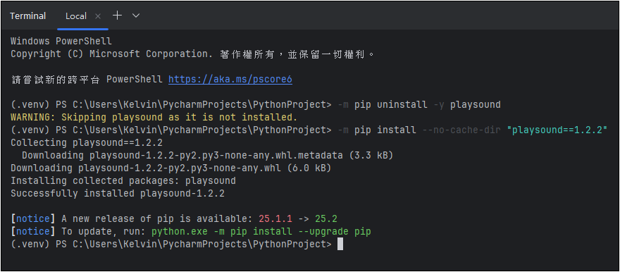加入 gTTS 輸出語音功能需求:pip install openai gTTS playsound == 1.2.2 進入 [ 程式碼分享區 ] 下載 v2 版本 執行時若出錯,可能原因是 PyCharm 安裝到最新版 playsound 1.3.0,而 1.3.0 在 Windows / Py3.13 上會嘗試建 wheel 然後失敗。 解法:把版本固定到 1.2.2(純 Python,不需要建 wheel ) 用 PyCharm 右下角的 Terminal 執行以下兩行 ( 請確認路徑 ): C:\Users\Kelvin\PycharmProjects\PythonProject\.venv\Scripts\python.exe -m pip uninstall -y playsound C:\Users\Kelvin\PycharmProjects\PythonProject\.venv\Scripts\python.exe -m pip install --no-cache-dir "playsound==1.2.2"