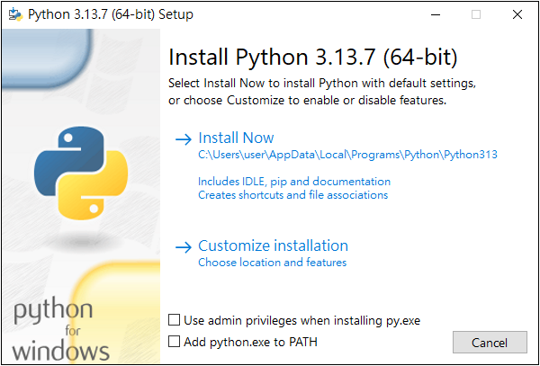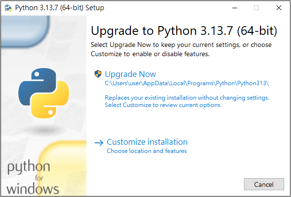 點擊 Downloads 後選擇 Python 下載版本。 若選擇 Customize installation 可自訂安裝 按下 Install 開始安裝。 若已安裝舊版… 或可先反安裝。