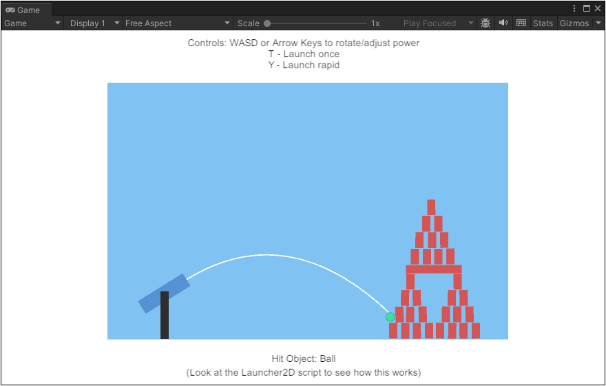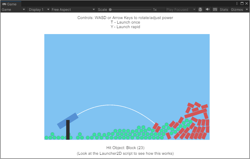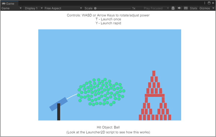 2D Example - 這是一個 Unity 2D 拋物線投擲遊戲,使用 WASD 或方向鍵控制砲台的角度與推力。 使用鍵盤 T - 發射單發砲彈 / Y - 發射多發砲彈