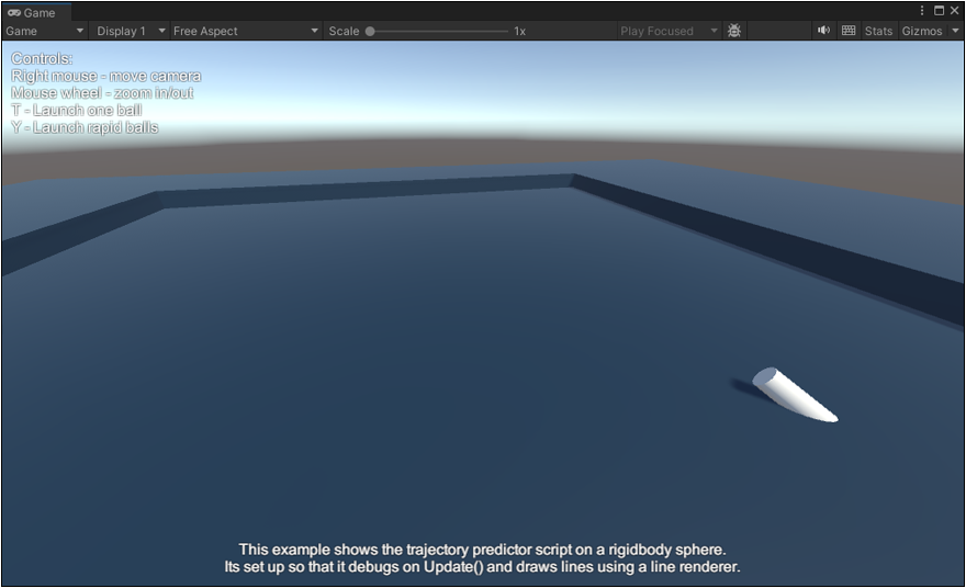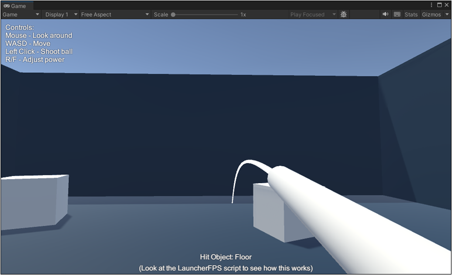 FPS Example 展示場景 - 使用鍵盤 WASD 行走,滑鼠移動改變視角,左鍵發射砲彈。 使用鍵盤 R / F 調整推力,拋物線為彈道。