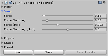開啟 Physics 設定項目,設定玩家角色的物理行為。 Force Damping : 使玩家受外部的力量,例如 ThrownBomb 爆炸的衝擊。”1”值完全不受影響,”0”值表示控制器將受到極大影響。