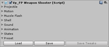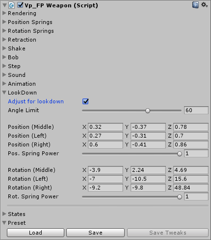 調整武器位置與角度1. 按下 Play 測試遊戲,注意 UFPS 可以在 Play 模式調整,並將參數儲存到檔案。 2. 透過 Vp_Fp Weapon 元件的 Position Springs 調整 Offset 設定武器的位置。 3. 透過 Vp_Fp Weapon 元件的 Rotation Springs 調整 Offset 設定武器的角度。 4. 武器調整到適當的位置與方向,可在下方的 Preset 按下 Save 按鈕,將設定的數值儲存到 .txt 文字檔。