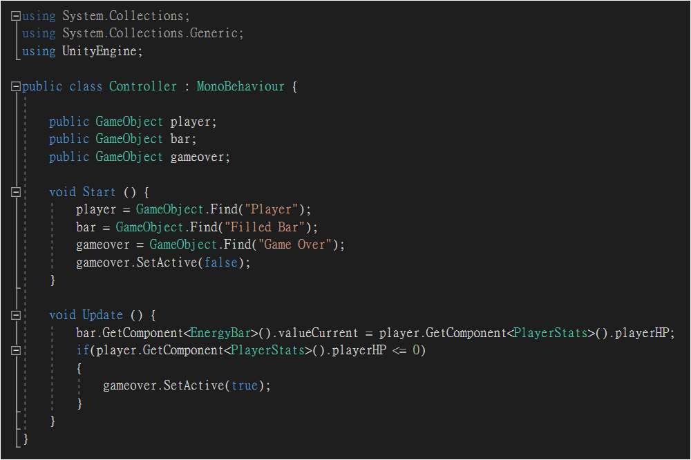 修改 Controller.cs 腳本,玩家血量低於 0 時將會出現 GAME OVER,實際上應該再讓玩家角色執行倒地的動作。