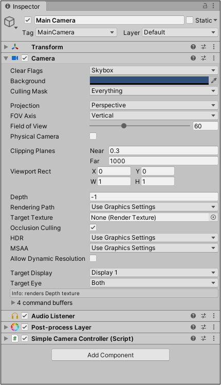 完成設定後即可調整 Exponential Fog 裡的參數,比較明顯的幾個項目 Density 是霧的密度、Fog Distance 是與霧的距離、Color Mode可以選擇霧的顏色類型,Sky Color 是跟天空一樣,看起來會比較自然,也可以選擇 Constant 將霧調整成其他的顏色。 Density = 0.5、Fog Distance = 5、 Color Mode = Sky Color