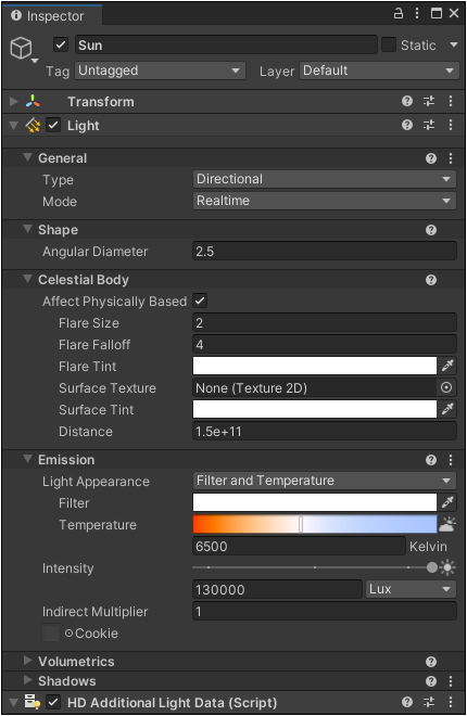 燈光部份可精準設定色溫 ( Temperature ) 與使用真實世界的照明單位 ( Physical Light units ) ,包括: Candelas ( cd ) / Lumens ( lm ) / Luminance ( nit ) / Lux ( lx ) / EV1000 ( EV ) 補充說明 Unity 新版本的定向光 Directional Light 已經更名為 Sun ,更貼近實際的使用情境。