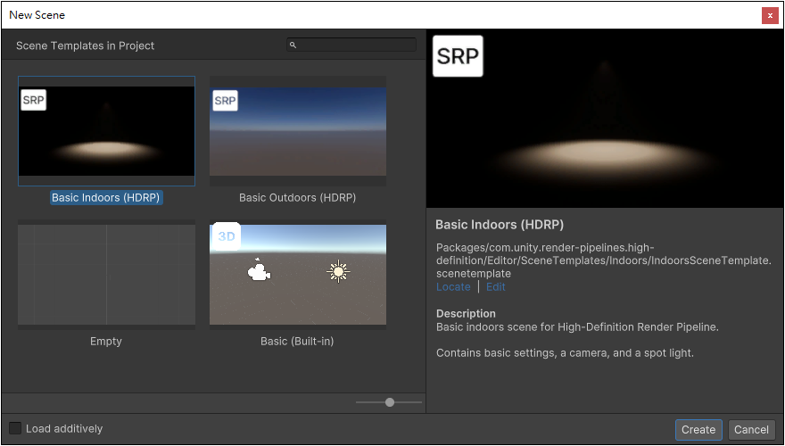 比較 HDRP 與 Built-in 專案的差異 建立新場景,可選擇 Basic Indoors (HDRP) 室內場景或 Basic Outdoors (HDRP) 室外場景。