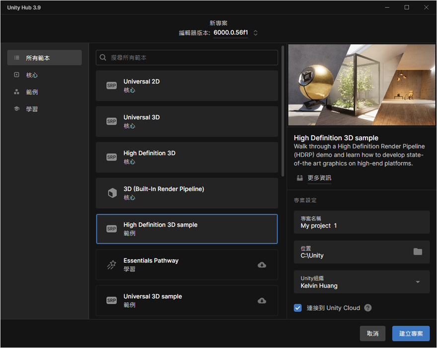首先建立 Unity HDRP 專案,例如選擇 High Definition 3D sample 範例專案。