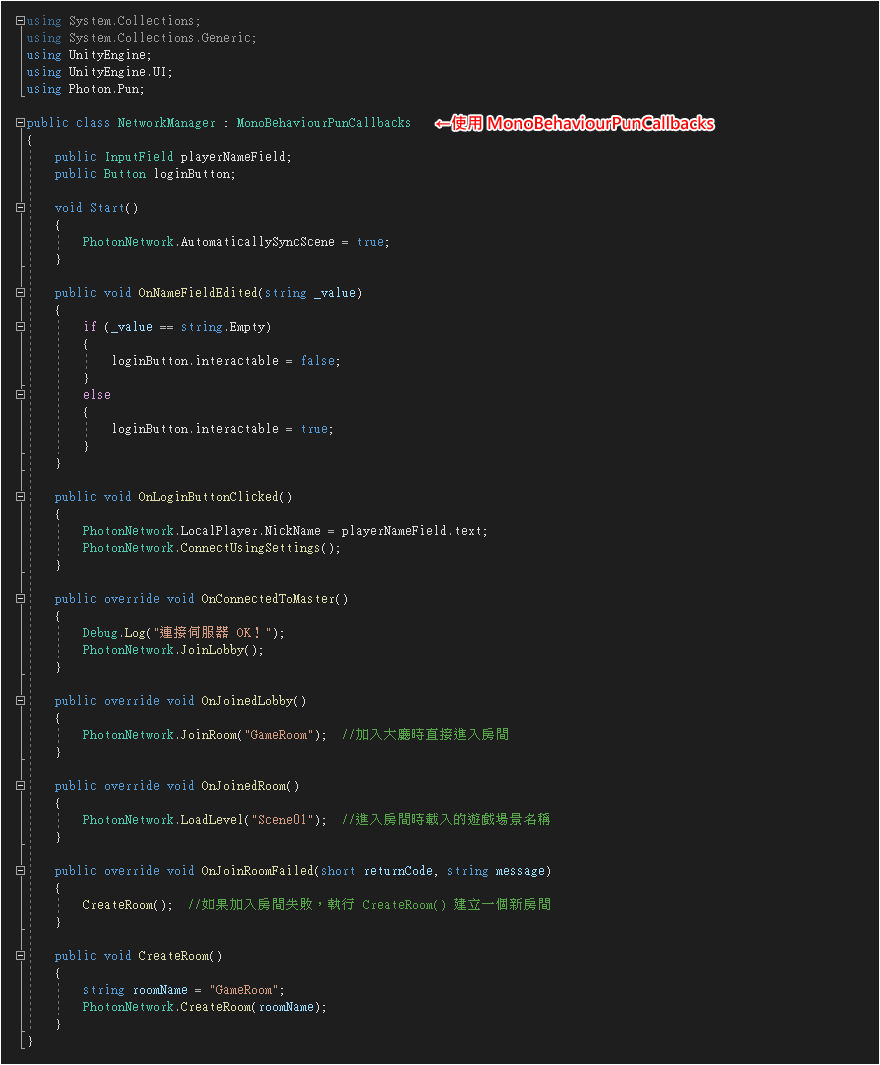 刪除場景中的 Player 玩家角色,儲存場景。 建立一個新場景,用於製作玩家登入畫面。 在此場景執行 [ GameObject > UI > Input Field] 建立文字欄位,並移到適當位置。 執行 [ GameObject > UI > Button ] 建立登入按鈕,移到適當位置,設定按鈕文字。 建立 C# 腳本並命名為 "NetworkManager" ,程式碼如下: